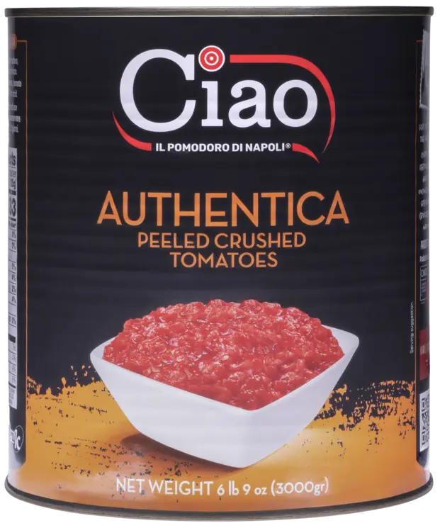 Los tomates triturados Ciao Authentica se elaboran con tomates italianos enteros y pelados, triturados y mezclados con puré de tomate fresco para lograr una consistencia perfecta. Estos tomates triturados no tienen piel ni semillas y tienen un mayor contenido de sólidos.