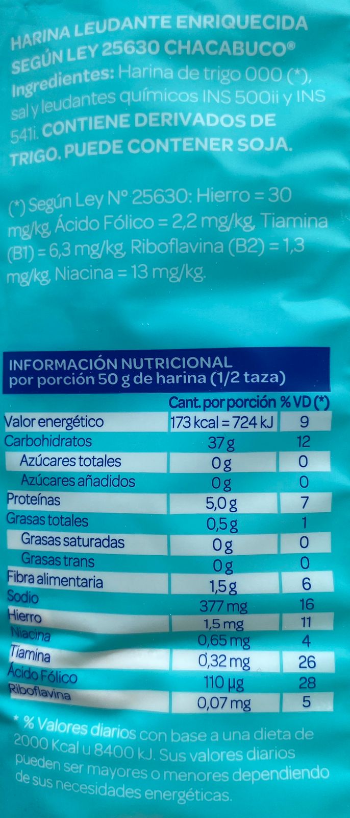 La harina leudante Chacabuco es obtenida a partir de la selección de nuestros mejores trigos. Es el producto más indicado para la elaboración de tortas, bizcochuelos y pastelería hogareña. Su calidad la hace ideal para preparar toda clase de platos que requieran una harina pensada especialmente para la cocina.