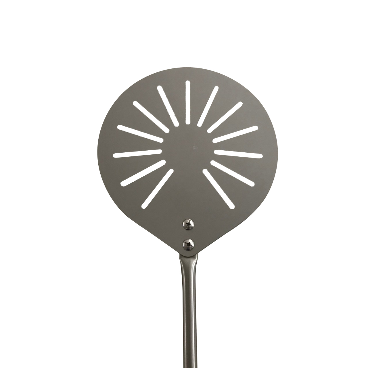 Fabricada 100% en acero inoxidable, esta pala circular nos facilita el deslizamiento de la misma debajo de las pizzas para que no se pegue en la base del horno ni se queme y se pueda hornear la pizza de una manera uniforme.