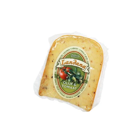 Queso Gouda Landana con Aceitunas y Tomate. Landana ACEITUNAS Y TOMATES es un queso holandés con un delicioso sabor mediterráneo, con tomates madurados al sol y aceitunas verdes. Ideal para platos fríos y calientes. Ideal para un sándwich de queso a la plancha, entre otras cosas.