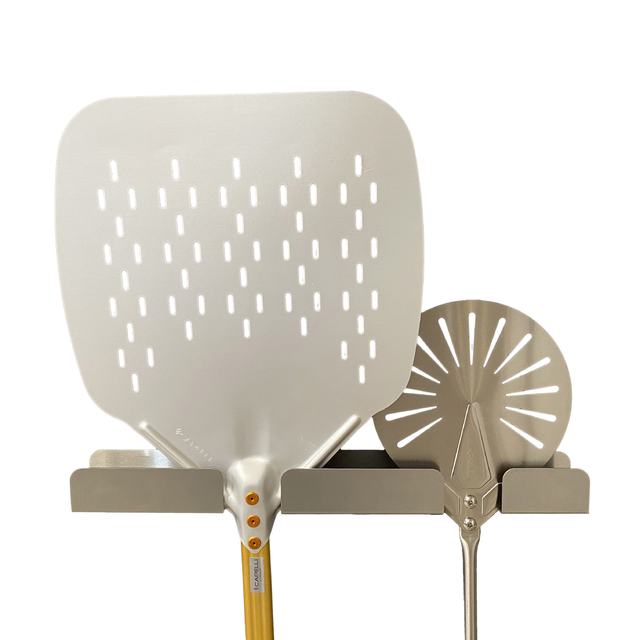 Soporte porta palas para tres herramientas, fabricado con acero inoxidable de 2mm ultra resistente para soportar las mayores exigencias.