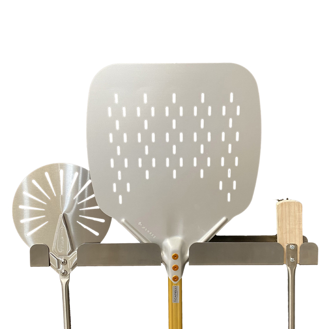 Soporte porta palas para tres herramientas, fabricado con acero inoxidable de 2mm ultra resistente para soportar las mayores exigencias.